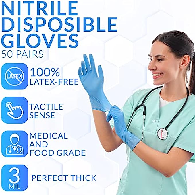 [100 Pcs] Nitrile Gloves - Powder & Latex Free Disposable Exam Gloves - Medical and Food Grade - 3 Mil - Touch Sensitive