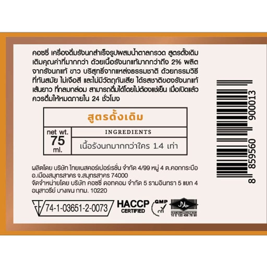 เครื่องดื่มรังนกแท้ สูตร Original หวานน้อย ขนาด 75 ml. เติมคุณค่าที่มากกว่า ด้วยเนื้อรังนกแท้เพิ่มขึ้นถึง 40% เนื้อรังนกแน่น อร่อยเต็มคำ ผลิตจากรังนกแท้คุณภาพดี ขาวแน่น บริสุทธิ์จากธรรมชาติ 100% สูตรของคอซซี่ มีรสชาติที่หอมหวาน กลมกล่อมที่ลงตัว ได้รสชาติของรังนกแท้ต้นตำรับ เส้นยาว ที่กลมกล่อม จึงรับประทานได้ง่ายสำหรับทุกวัย สามารถดื่มได้ทั้งแบบอุ่นร้อน และแช่เย็น