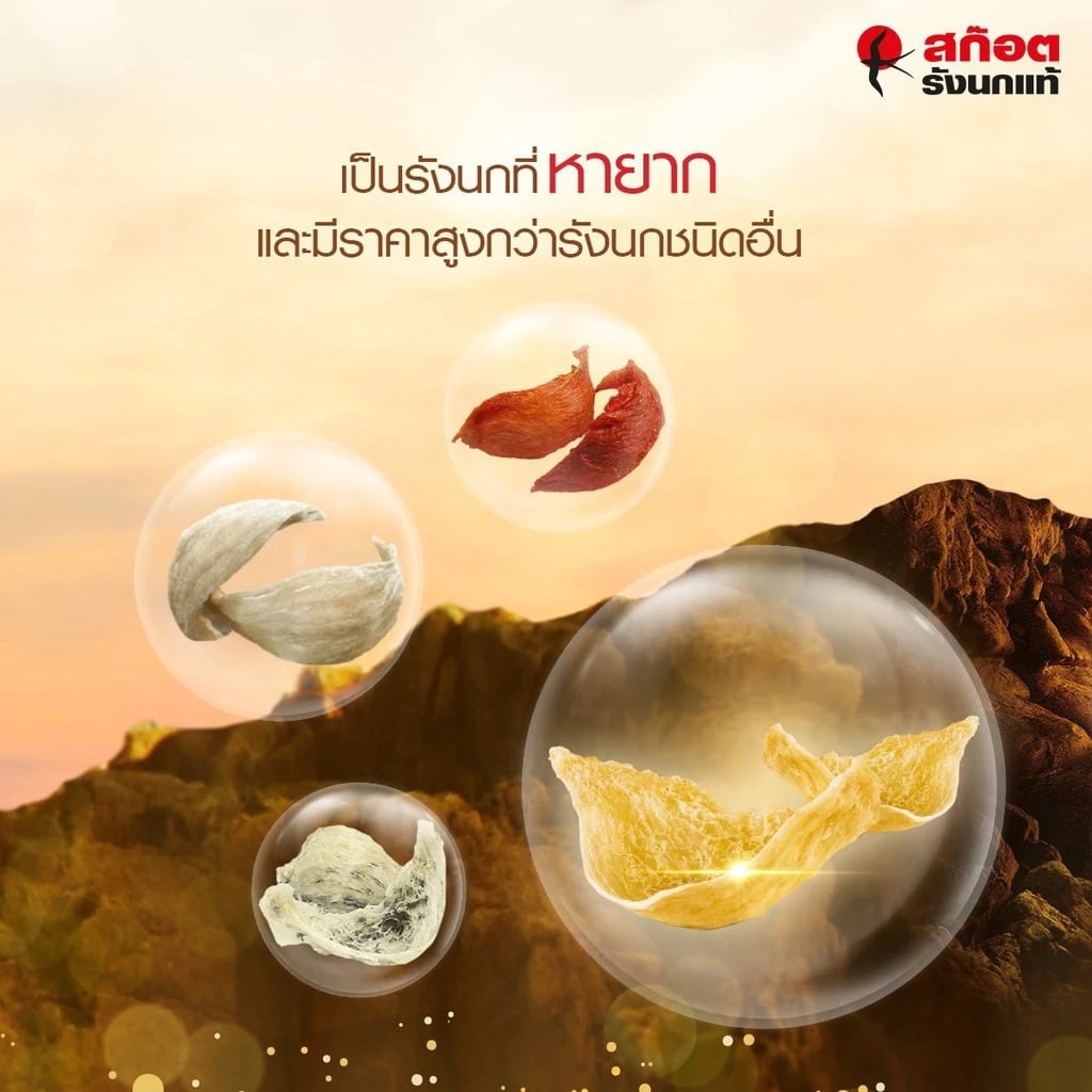 คัดสรรจากรังนกไหมทองที่ดีที่สุดเป็นรังนกแท้ 100% ผลผลิตจากถ้ำธรรมชาติในเกาะทางภาคใต้ของประเทศไทย มีสารไกลโครโปรตีน และสารนานา