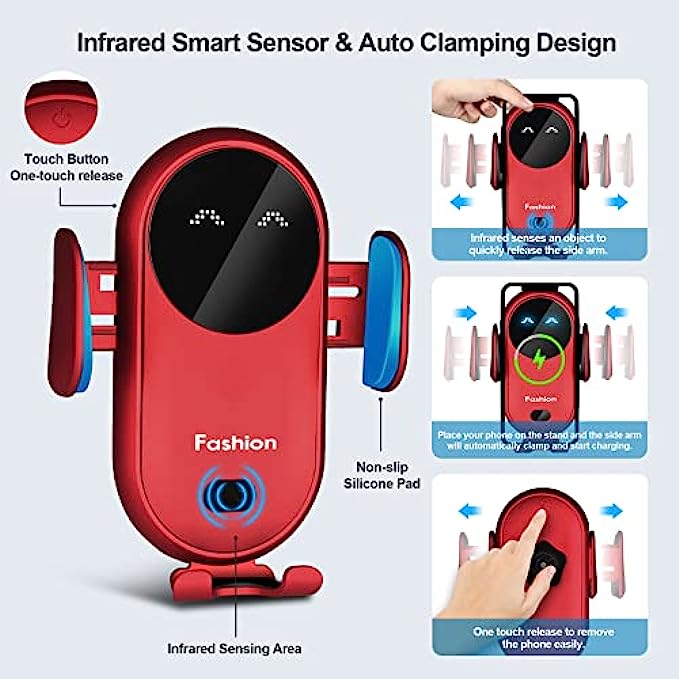 • ?Infrared Auto Sensing: Put your phone close to the infrared auto-sensing area of the bracket, it will automatically open to its widest and pause for 2 s(put your phone in time), then automatically retract. When touch the button on the back of the mount, it will release and you can remove the phone.