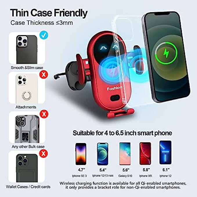 • ?Thoughtful Note: Low output voltage from the car's own USB port can cause the wireless charger to open &close constantly or not work. The typp-c port is not plugged in tightly, phone case is too thick or with magnetic/metal/foreign objects, it will cause the device to be unresponsive, slow to charge or hot.