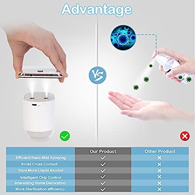 • ?Ultra-sonic Atomization Technology : Touchless two hands sanitizing device, sanitizing mist sprayer, microporous atomization. Sanitizer spray for restaurants, car hand sanitizer dispenser, silent and moisturizing. The sanitizer can evenly apply to all surfaces of hands or cell phones, helping families effectively avoid cross infection.