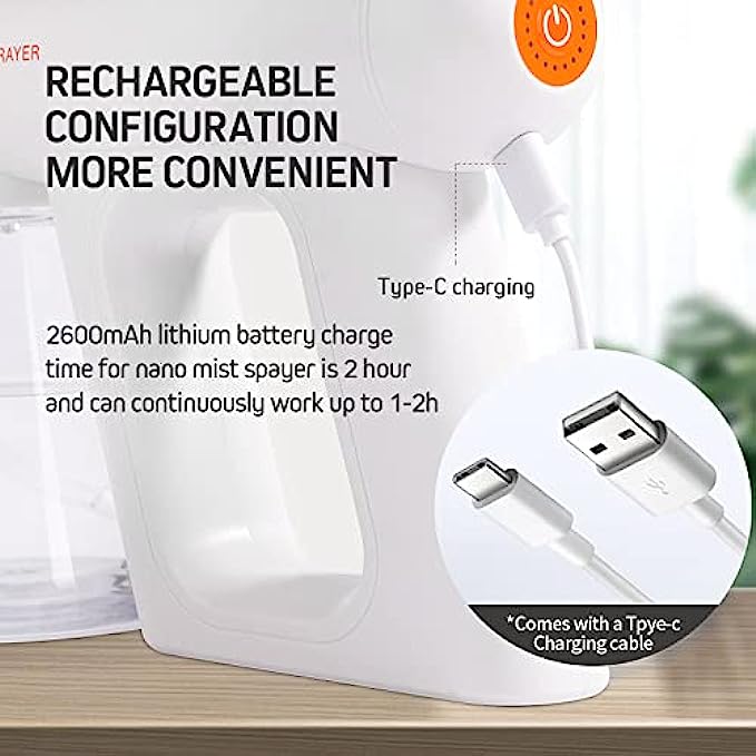 • 【???????????? ?????????????】The rechargeable USB cable is universal along with package(Not included 5V adapter), you do not need to exchange new batteries, 2600mAh lithium battery,fully charge time for nano mist spayer is 2 hour and can continuously work up to 1-2h.