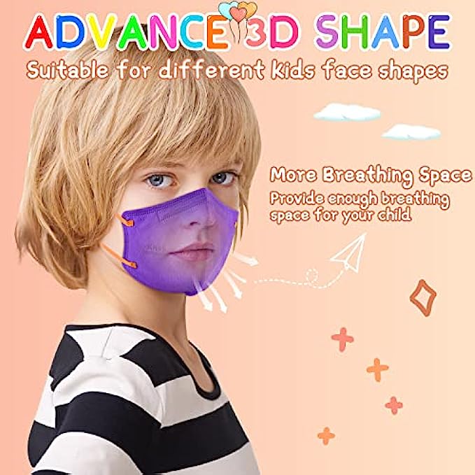 • MULTI-COLOR KN95 KID MASKS: Sized at 5.51 inches x 7.08 inches, and the length of the ear loop is 3.2 inches, the stretched length is 7.5 inches. With 5 colors of KN95 kid masks: purple*10pcs, orange*10pcs, yellow*10pcs, green*10pcs, blue*10pcs, total 50 PCS kids face mask. Each kn95 mask comes with a different color ear loop, It can increase the fun of children wearing masks, matching various clothes to show their personality.