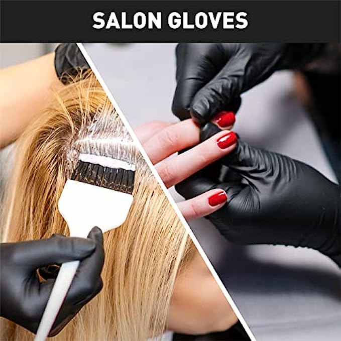 PROPER SIZE MATTERS - Vinyl disposable gloves are less form-fitting and elastic than latex or nitrile gloves, but more economical. Please refer to the size chart to find your own size. One-Size-Up is recommended if you are lingering between two sizes. Tight-fitting may cause gloves run into rips and tears. ENHANCED HAND PROTECTION - Crafted with 5 mil thick food grade high quality Polyvinyl Chloride (PVC). Provide good performance when your works encounter with dirty, dusty. More durable and convenient. COMFY FOR ALL - Smooth texture ensures tactile sensitivity to feel fine parts. Able to operate mobile phone while wearing gloves. Packaged 50 Black vinyl disposable gloves per box. Come in small, medium, large and extra-large sizes, suitable for both men and women. SAFE CHOICE - General purpose latex-free and powder-free disposable gloves are perfect for those who are allergic to the latex, and do not have a powder coating inside the glove, reducing the risk of allergic reactions and contamination. HIGHLY VERSATILE - Perfect for cooking, food handling, BBQ, gardening, cleaning, hair coloring etc. Suit for household and commercial situations like kitchen, laboratory, restaurants, public service, beauty hair salon, veterinary, and more.