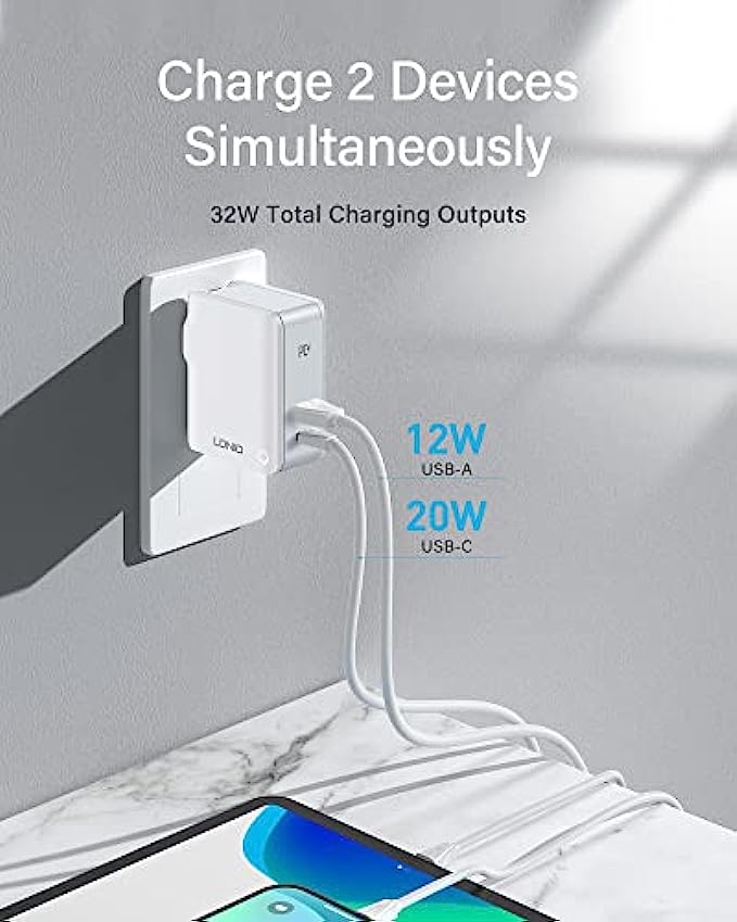 • 【Charge 2 Devices Simultaneously】This USB C wall charger can deliver up to 32W in total. Get both a USB-C PD port(20W Max) and USB-A port(12W Max), which are designed to fuel both smartphones, tablets, or other accessories simultaneously, and it also helps save precious space in your travel bag.