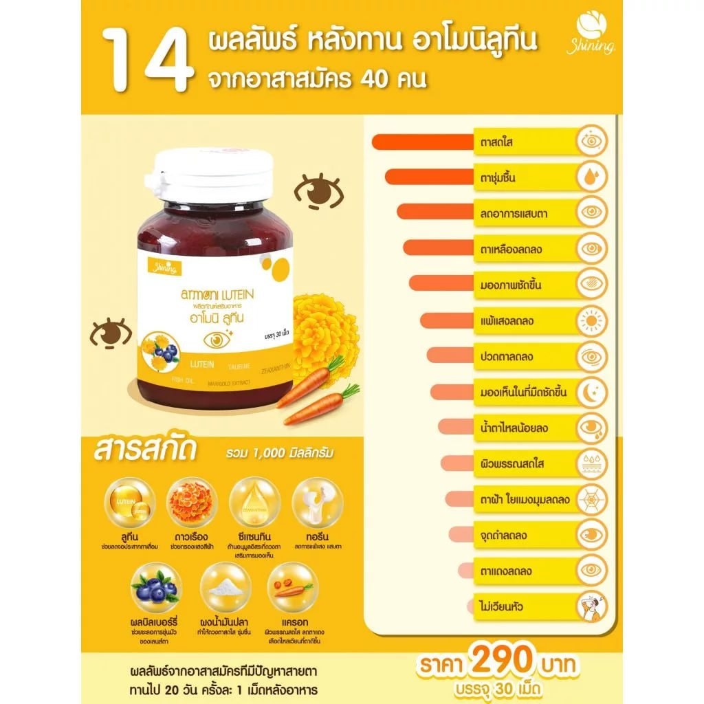 วิตามินบำรุงดวงตา ชะลอการเสื่อมของดวงตา ตาใส ตาหวาน ลดอาการแสบตา ลดอาการเคืองตา ลดอาการตาเหลือง ลดการเกิดต้อ ตาชุ่มชื้น ไม่แห้ง