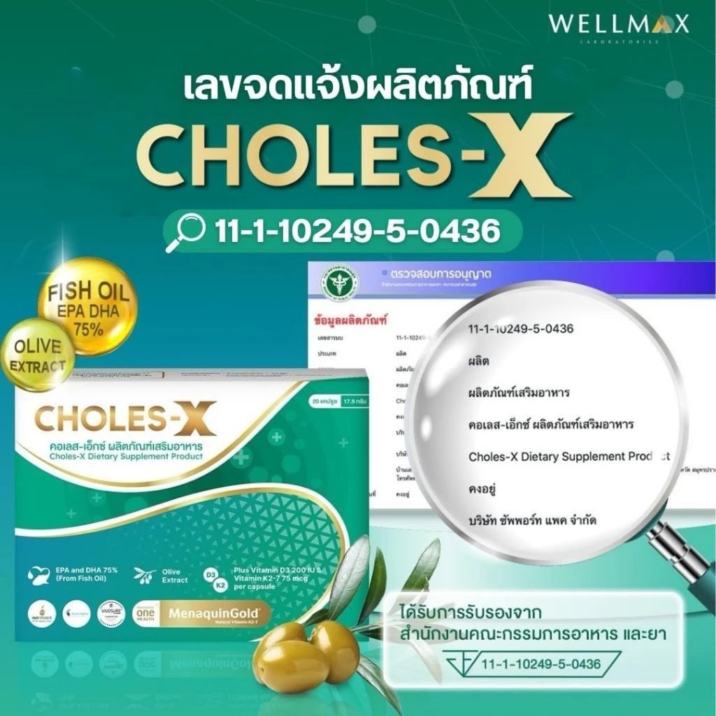 CHOLES-X คอเลส เอ็กซ์ ผลิตภัณฑ์เสริมอาหาร สารสกัดจาก Olive VitaminK2-7 VitaminD3 EPA DHA Extract
