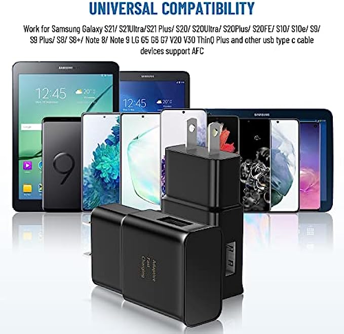 • Type C Charger Fast Charging:Compatible Samsung Galaxy S21 S21+ S21Ultra S10 S9 S8 S22 S22Ultra S22+ S20 S20 Plus S20 Ultra Z Filp 3 Fold 3 Note20 Note10 S10+ S9+ S8+ Note 8 Note 9,LG G5 G6 G7 V20 V30 ThinQ Plus and other usb type c cable devices support AFC (Adaptive Fast Charging)