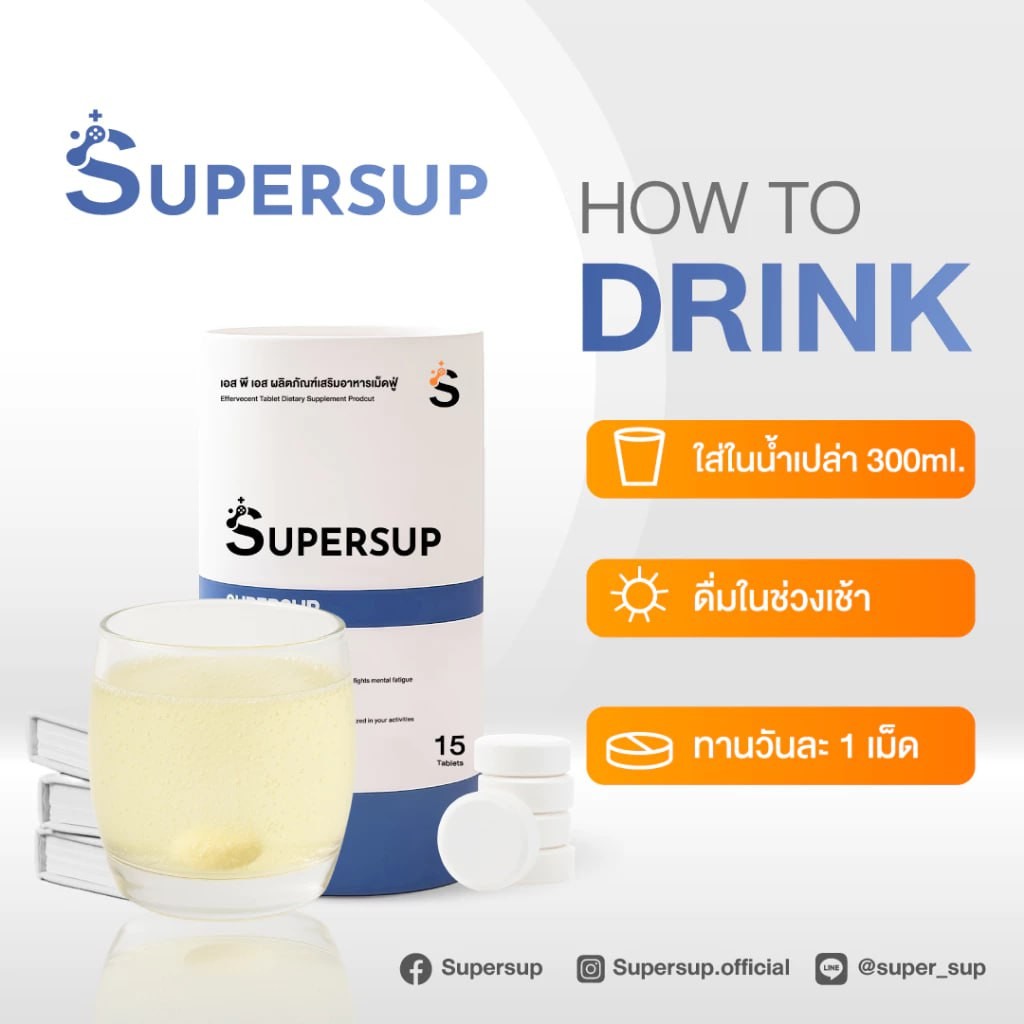 ใส่ Supersup 1 เม็ดลงในน้ำเปล่า 240 ml รอเพียง 5 นาทีก็สามารถดื่มได้ พร้อมทำงานต่อได้เลย