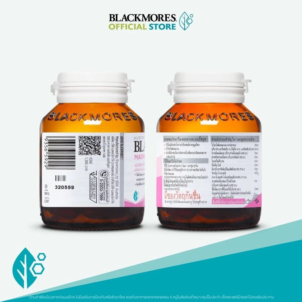 - แบลคมอร์ส มารีน คอลลาเจน แอปโซลูท ผลิตภัณฑ์เสริมอาหาร ประกอบด้วย ไฮโดรไลซ์ คอลลาเจนพร้อมด้วย โคคิวเทน, ลูทีน, สารสกัดเมล็ดองุ่น, สารสกัดฮอร์สเทล, และสารสกัดเปลือกสนมาริไทม์ฝรั่งเศส รวมถึงมีแร่ธาตุสังกะสีที่มีส่วนช่วยในการสังเคราะห์โปรตีนตามปกติ และคงสภาพปกติของผิวหนัง ซีลีเนียมที่มีส่วนช่วยในการปกป้องเซลล์จากอนุมูลอิสระ