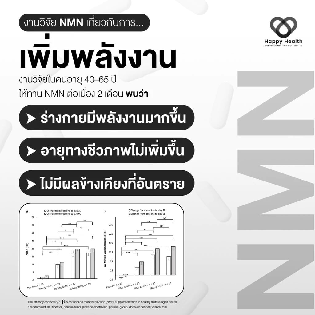 ชื่องานวิจัย: "The efficacy and safety of -nicotinamide mononucleotide (NMN) supplementation in healthy middle-aged adults" ตีพิมพ์ในวารสาร GeroScience ปี 2023