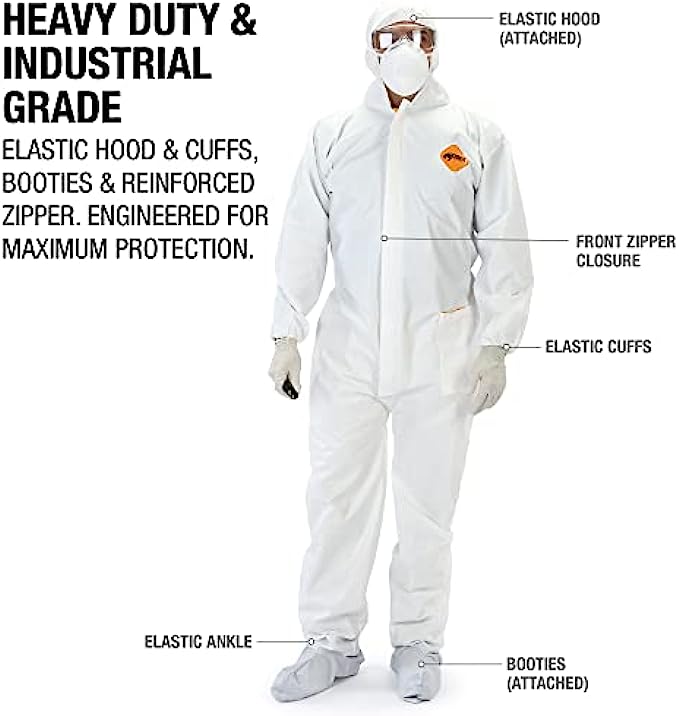 INDUSTRIAL GRADE: Heavy duty coverall with elastic hood and cuffs, full booties, and reinforced zipper.
