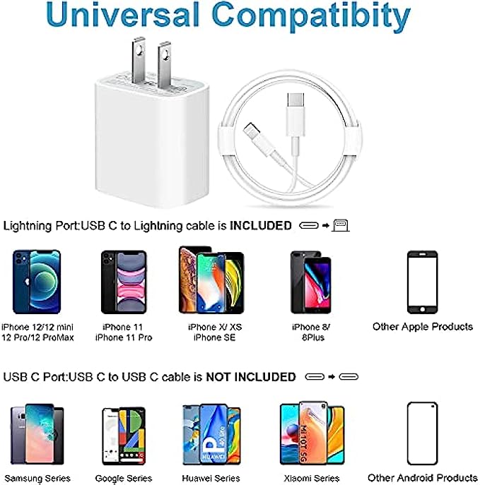 【Romitaz PD 3.0 Fast Charger for iPhone】 iPhone Fast Charger equipped with 20W PD 3.0 USB Type C power delivery wall plug, PD 3.0 Quick-Charge USB C port provides Max 20W output power, charge your device up to 3x faster than original 5W charger,charging your iPhone 12 up to 50% in just 30 minutes, saving over 1.5hrs for you. 【Apple MFi Certified Lightning Cord】 With the Apple MFi Chip, the USB-C to lightning cord equips automatic chip recognition function. The Apple MFi Certification ensures 100% flawless compatibility with Apple devices. No more trigger warning messages. 【Applicable Apple Equipment】 Use the official iPhone lightning cable with Romitaz 20W USB C wall charger to access fast-charging for iPhone13/ 13 Pro/ 13 Pro Max/ 13 mini, iPhone 12/ 12 Mini/ 12 Pro/ 12 Pro Max/ SE 2020/ 11/ 11 Pro/ 11 Pro Max/ XS/ XS Max/ XR/ X, 8/ 8 Plus, iPad, iPad Pro, iPad mini, iPad Air. This Romitaz Power Delivery 3.0 FAST charger also charge for iPhone 7 6 Plus, iPhone 5 5c 5s SE Airpod in a original charging speed. 【Safety Efficient Fast Charging】 The Power Delivery Wall Charger for iPhone owns bulit-in multi-protection system, avoiding from over-voltage, over-charge, over-heat, etc. The smart chip including in the MFi certified lightning cable match the current required by the Apple device automatically, charge your iPhone/iPad device fast, safely and steadily.Tangle-free 6 Feet length is convenient for usage while charging and sync at home/office/travel in bed, hotel rooms, and more. 【What You Get】1x 6FT Cable and 1 x USB C Wall Charger.