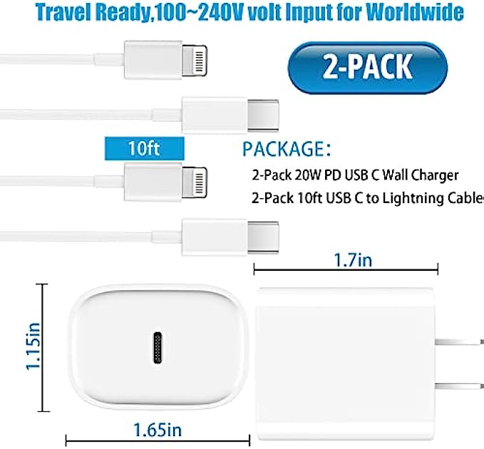 【Hassle-Free Service】2pack iPhone charger block + 2pack MFi Certified Long Charger Lightning cable (10Ft).We will provide a 12-month worry-free warranty friendly customer service.Please don’t hesitate to contact us and we promise to solve your problems within 24 hours