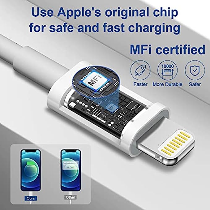• [Apple MFi Certified Lightning Cable]With the Apple MFi Chip, the USB-C to lightning cord equips automatic chip recognition function, full support with iOS versions.20W USB-C Charger Offers Multiple Safeguards Automatically. Multi-Charging Protection Keeps Your Device Safe From Over-Current Over-Voltage Over- Heating & Short-Circuiting.