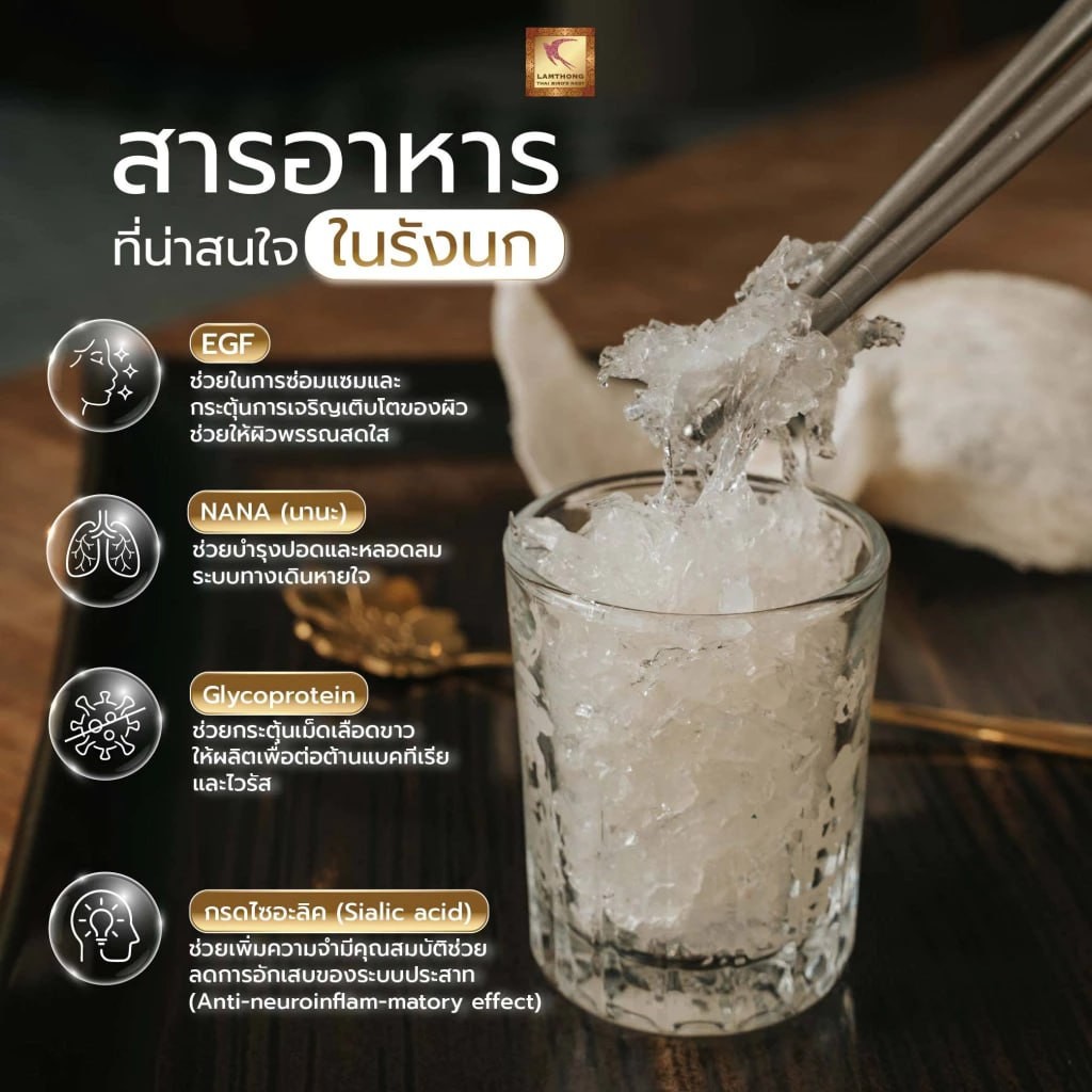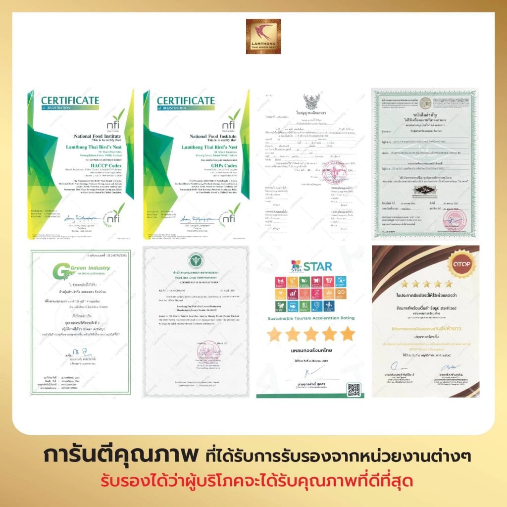 - รังนกแท้ คุณภาพเกรดดีเยี่ยม ที่ผ่านกระบวนการผลิตจากโรงงานที่ได้มาตรฐานสากล ทั้ง GMP, HACCP CODEX อีกทั้งยังได้รับการรับรองเครื่องหมายฮาลาล และ อย.