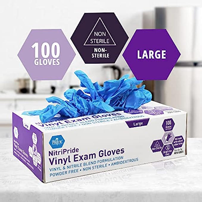 Med PRIDE NitriPride Nitrile-Vinyl Blend Exam Gloves, Large 100 - Powder Free, Latex Free & Rubber Free - Single Use Non-Sterile Protective Gloves for Medical Use, Cooking, Cleaning & More