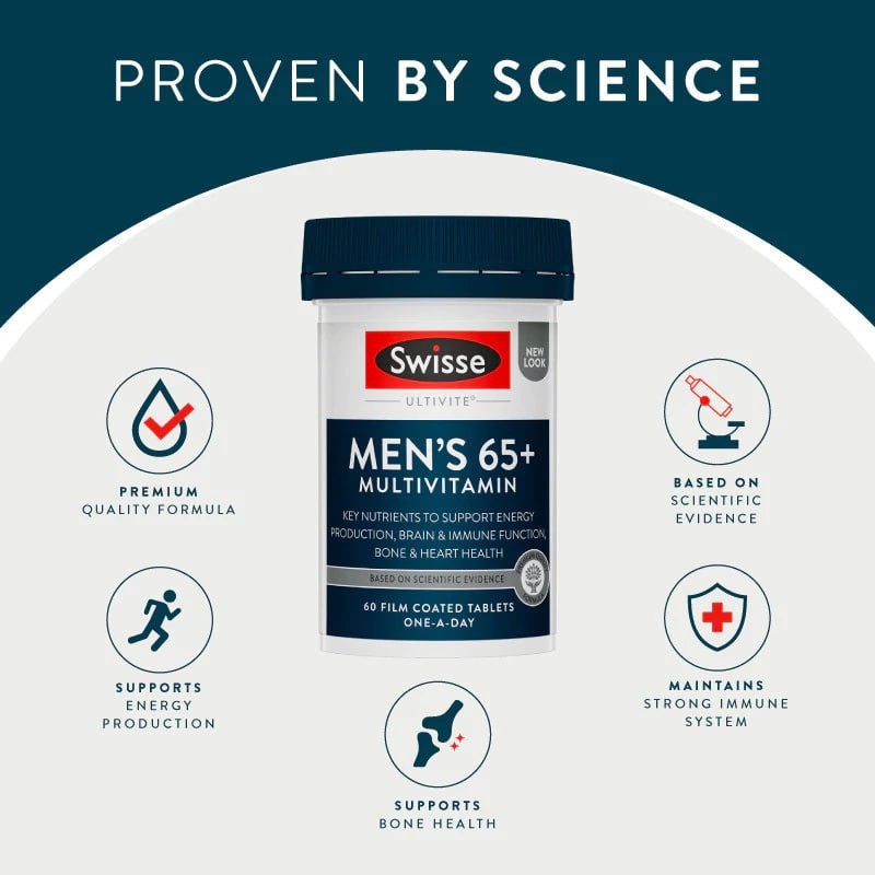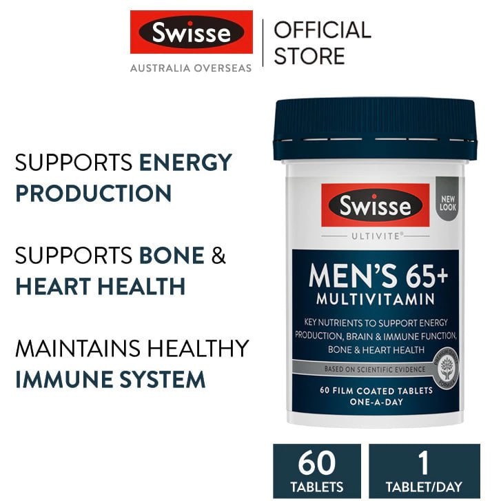 Swisse Men's Ultivite 65+ Multivitamin เป็นสูตรคุณภาพระดับพรีเมียมที่ประกอบด้วยวิตามิน แร่ธาตุ และแร่ธาตุต่างๆ เหมาะสำหรับผู้ชายที่มีอายุมากกว่า 65 ปี เพื่อช่วยเสริมสร้างการผลิตพลังงาน การทำงานของสมองและภูมิคุ้มกันที่แข็งแรง สุขภาพกระดูก สุขภาพหัวใจ สายตา และการตอบสนองตามธรรมชาติของร่างกายต่อความเครียด