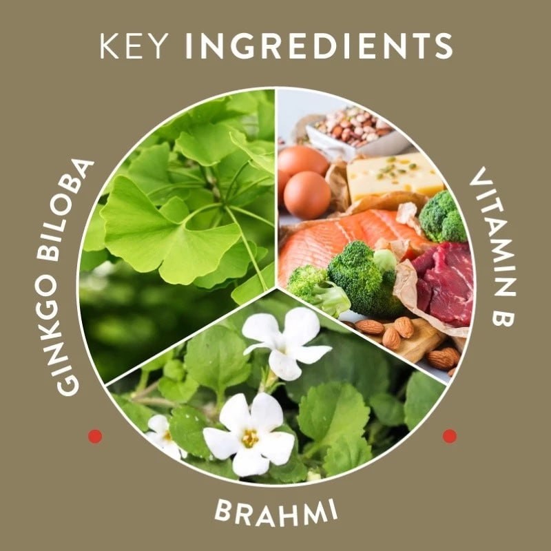 ประสิทธิภาพทางจิต: วิตามินบี 5 สนับสนุนการทำงานของจิต สมาธิ และโฟกัส แปะก๊วยสนับสนุนการไหลเวียนโลหิตที่ดีต่อสุขภาพไปยังส่วนปลายของร่างกายรวมถึงสุขภาพของสมอง