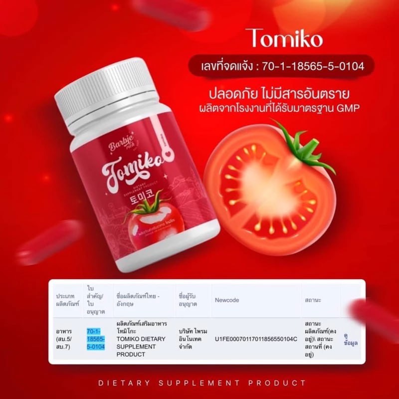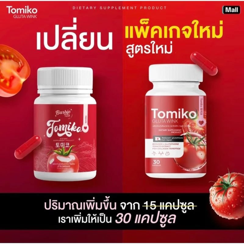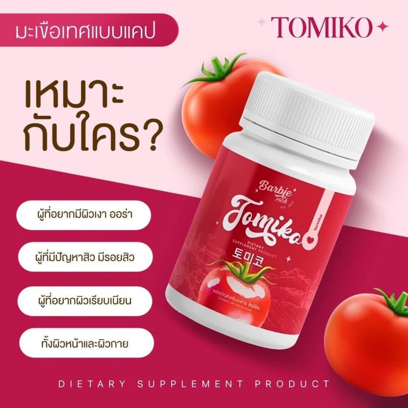 ?1แถม2?กลูต้าโทมิโกะ TOMIKO มะเขือเทศอัดเม็ด Barbie rich ลดสิว ผิวขาวกระจ่างใส ลดรอยดำ ลดรอยแดง