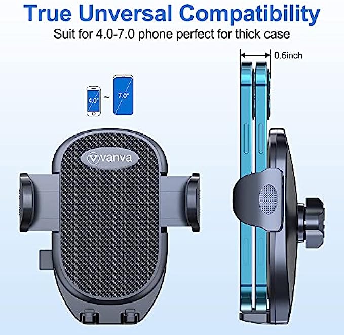 [ vanva Ultimate Car Phone Holder ] With the latest improved vent clip [Don't Slip & Drop], this car phone holder could hold your phone firmly even on the bumpiest road or sharper turn. This phone car holder is made from the most advanced durable sturdy aviation-grade materials,it is the first phone mount car to pass most extreme test on the market, making it more resistant to abrasion and corrosion. [ Screw the Vent Clamp Tightly & Secure Stable Install ] vanva car phone mount adopts the latest screw mechanial lock design which holds your phone securely to the vent. Screw the clamp and the rubber clip hook will catch one of the car air vent blades tightly, even if you hit a bump or a sharper turn. After take few seconds to install it well, which won't distract you from driving. [ Rotate Freely & Adjust Perfect Angle as You Like] Dual to the 360-degree swivel head, your phone can be rotated easily to landscape and poraits as well as anywhere in between, with the vanva car mount. This air vent car mount allow you secure your smartphone to the air vent firmly, keeping it in place whilst the optimal viewing angle. Easily lay and remove your phone using the widely comfortable phone cradle with instant release button. [ Hold Your Phone Stably & Drive without Distracting ] vanva phone mount holder has anti-slip rubber pads, stable support shelf, firm & scratch-free claw offer secure grip for your cellphone to ensure safer driving. With all above these, the stability increase 5 times, even can stable support big phones and thick cases. [ Fit Universally & Get 24 Months Worry Free Warranty ] With our car phone mount, you'll enjoy 24 months warranty. This cell phone car mount is fit for almost all phones, include iPhone 13/ 13 Pro / 13 Pro Max/ 12/12 Pro/12 Pro Max/12 Mini/SE/ 11 /11 Pro /11 Pro Max /XS / XR / XS Max / X / 8 / 8 Plus / 7 / 7 Plus / SE / 6s / 6 Plus / 6 / 5s / 5, Samsung Galaxy S10 / S10+ / S10e / S9 / S9+ / S8 / S8+ /Note 10+ /Note 10 / Note 9/Note 8/ S7 / S7 Edge / S6 S6 Edge / S5 / S4, LG, Google Pixel etc.